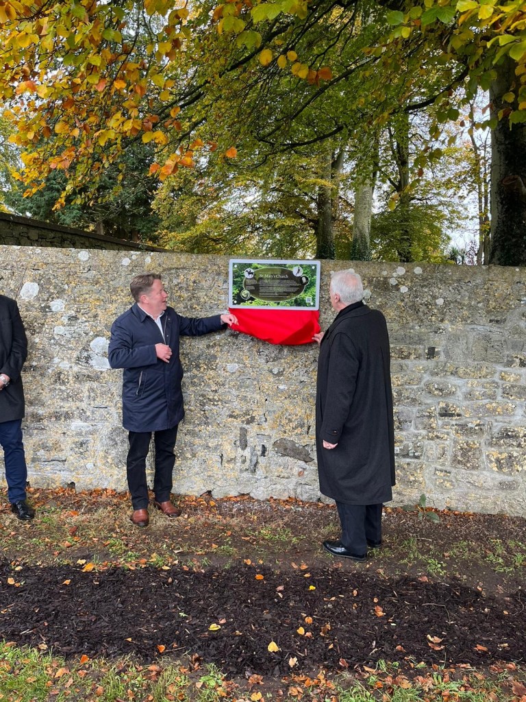 First in the running order was an unveiling of a plaque outside the main gate. Designed by Susan Flatley, it gives a short history of the site and links to this website with a QR code. The plaque was unveiled by Minster Daragh O’Brien and Archbishop Michael Jackson.